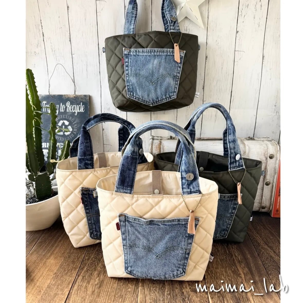 デニムリメイク★ナイロンキルトお散歩トート