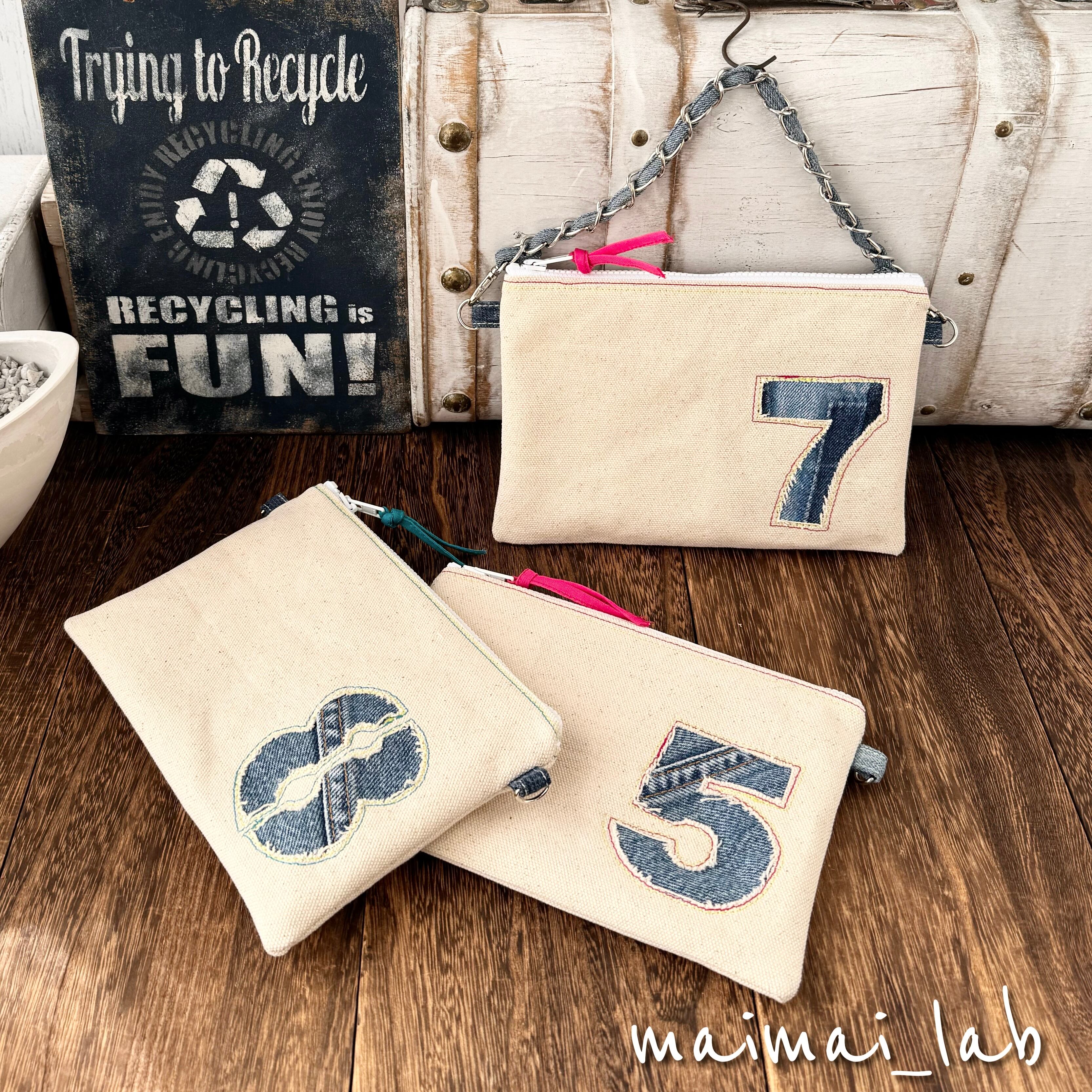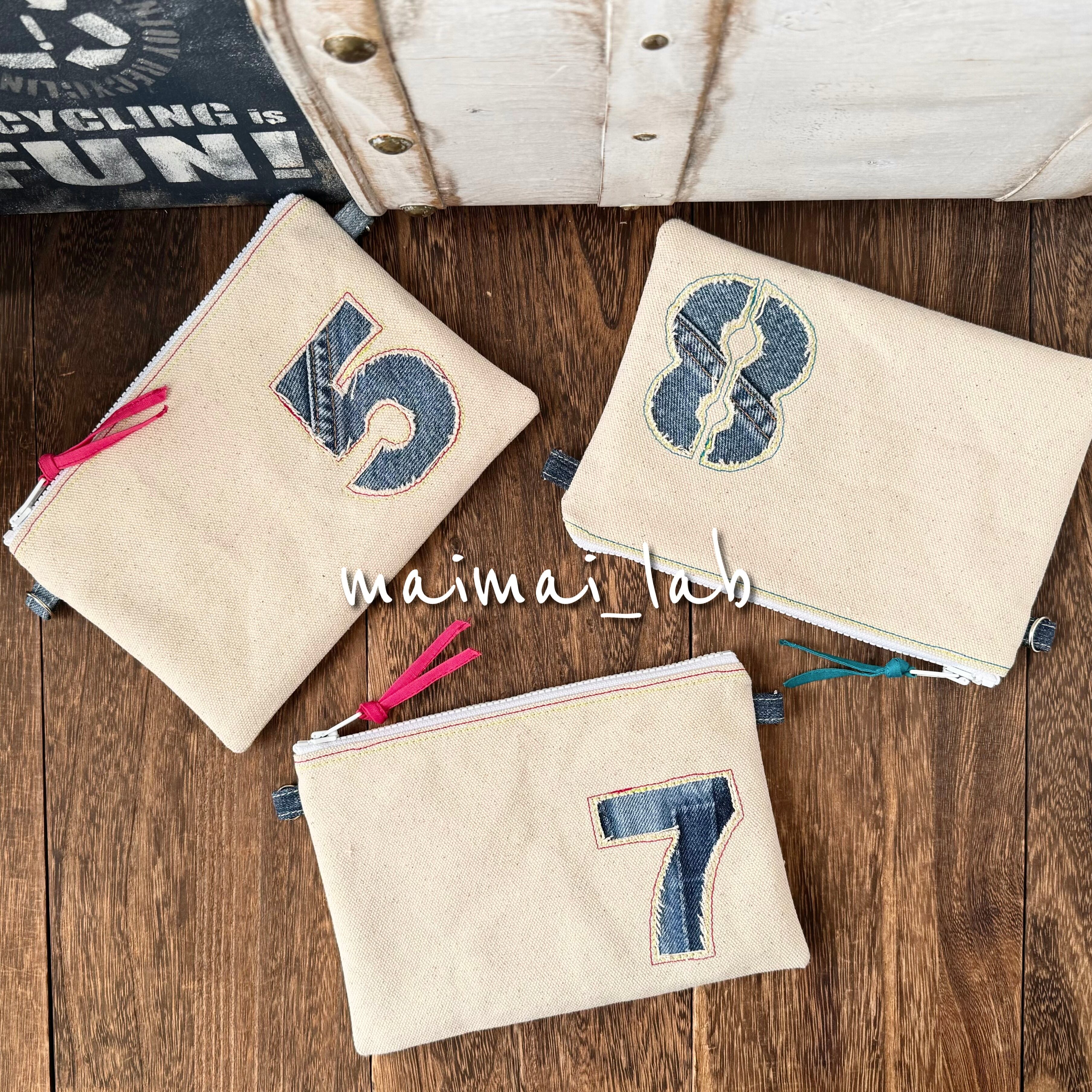 アイボリーの帆布にくり抜きデニムナンバー